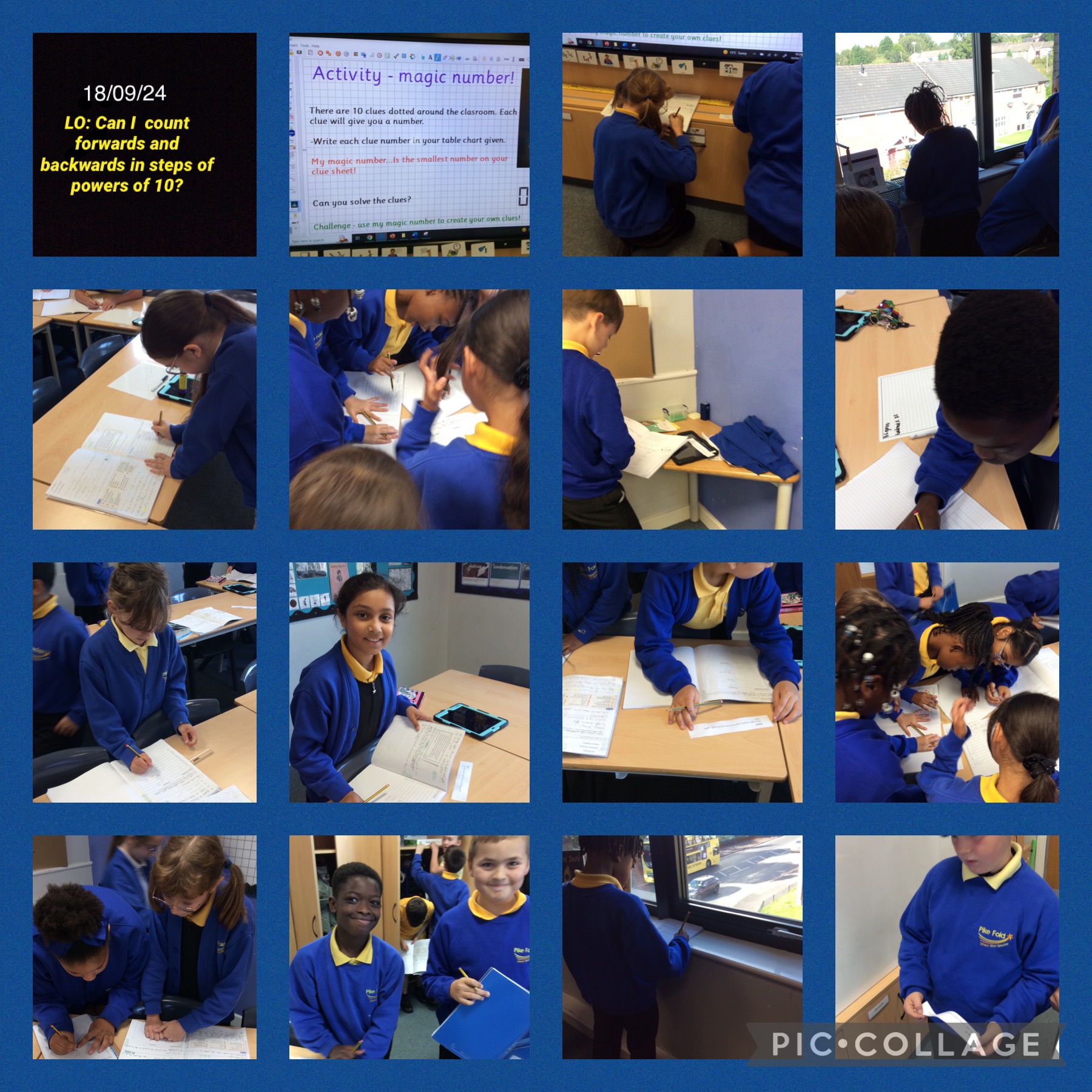 5F worked together to answer clues hidden around the classroom that required them to use the powers of 10.
