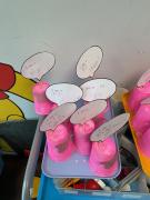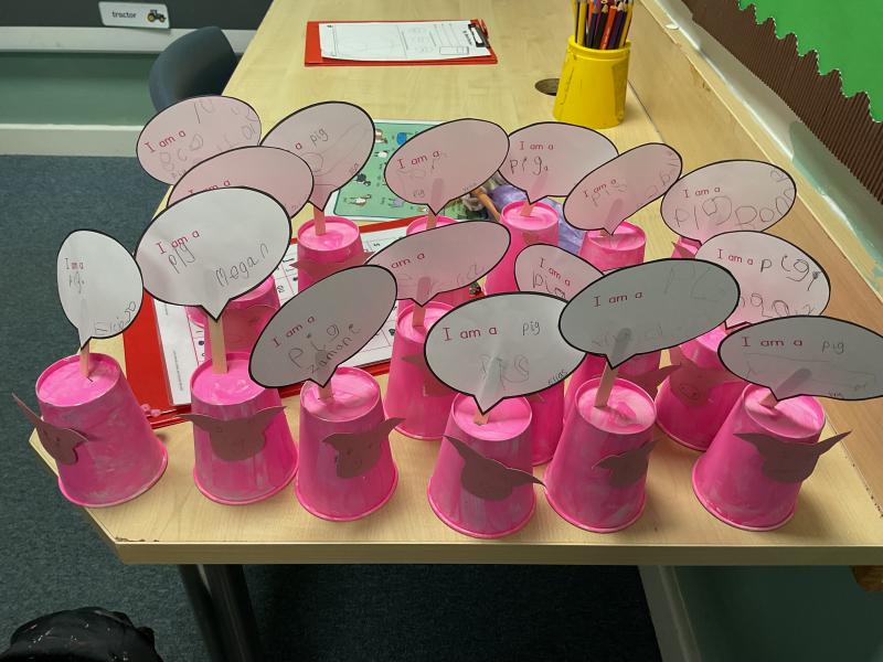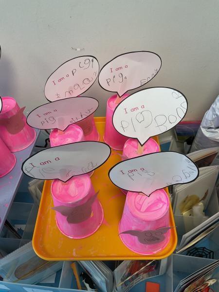 The nursery children made pigs using craft materials. They carefully created their pigs and then wrote labels for them. On each label, they wrote the word “pig” and their own name. The children enjoyed being creative and practising their writing skills at the same time.